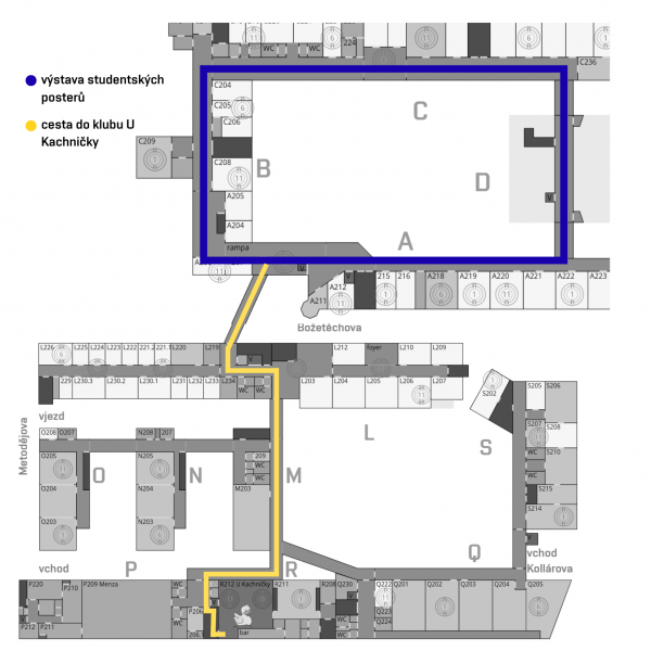 Prosím vezměte na vědomí, že v této době se budou mohou studenti SŠ pohybovat po části fakulty sami. Jedná se o 4 chodby, kde budou vystaveny projekty Excelu, a cestu do klubu U Kachničky (viz mapa). Cesta bude řádně vyznačena a studenty upozorníme, že pohyb mimo tyto koridory není povolen.